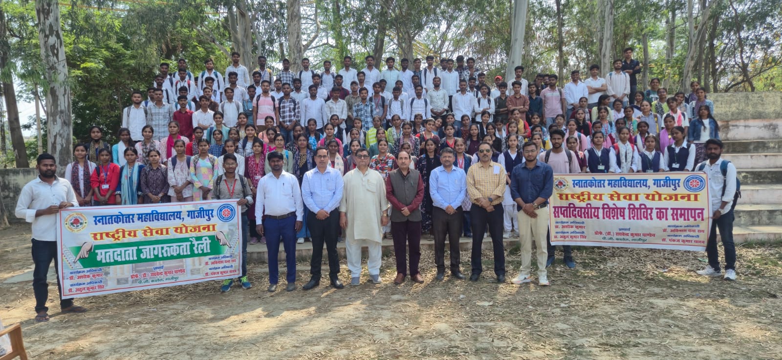 *गाजीपुर। स्नातकोत्तर महाविद्यालय, गाजीपुर की राष्ट्रीय सेवा योजना की चारों इकाइयों के सात दिवसीय विशेष शिविर का भव्य समापन मंगलवार को संपन्न हुआ। कार्यक्रम का आयोजन प्राचार्य प्रो. राघवेन्द्र कुमार पाण्डेय, प्रो. विनय कुमार दुबे, प्रो. संजय चतुर्वेदी और डॉ. शैलेंद्र सिंह की गरिमामयी उपस्थिति में हुआ। समापन समारोह के