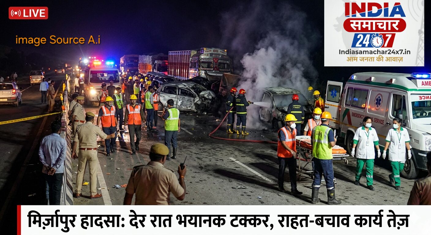 उत्तर प्रदेश के मिर्जापुर में बुधवार की रात एक भीषण सड़क हादसे ने पूरे इलाके को स्तब्ध कर दिया। एक अनियंत्रित तेज रफ्तार ट्रक ने पीछे से बोलेरो, कार और कंटेनर को जोरदार टक्कर मार दी। यह भिड़ंत इतनी जबरदस्त थी कि बोलेरो में देखते ही देखते भीषण आग लग