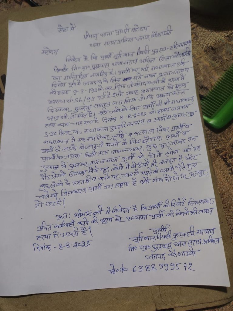 ।मामला कौशांबी के थाना सराय अकिल के पुरखास गांव का है जहां एक परिवार ने पूरे गांव में आतंक मचा रखा है। मर्डर राधाकांत त्रिपाठी पिता स्व हरिनारायण त्रिपाठी, आशीष त्रिपाठी पिता राधा कांत त्रिपाठी ने अपने ही परिवार के लोगों को नहीं जीने दे रहे। इनके डर से इनके भाई का एक परिवार गांव छोड़ कर नैनी चले गए। अब अपने ही भाई को जान से मारने की कर रहा है कोशिश। सूर्यकांत पिता स्व हरिनारायण, श्रीप्रकाश पिता सूर्यकांत को आज शाम 5 बजे जान से मार देने के इरादे से दोनों कुख्यात अपराधी बीच में लाठी वो फरसा लेकर दौड़ा लिए। किसी तरह से पीड़ित ने भाग कर बचाई अपनी जान