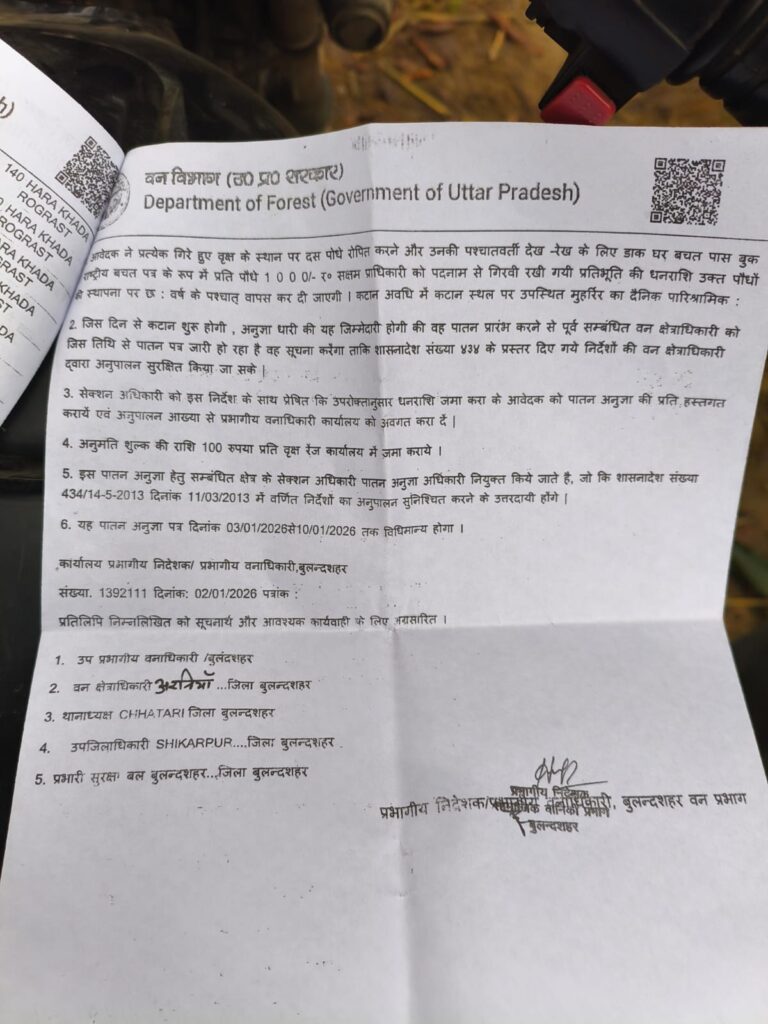 क्षेत्र में आक्रोशगाँव के लोगों में इस अवैध कटान को लेकर गहरा रोष है। ग्रामीणों का कहना है कि अगर जल्द ही इस पर रोक नहीं लगाई गई और दोषियों पर सख्त कार्रवाई नहीं हुई, तो पर्यावरण को होने वाली इस क्षति की भरपाई नामुमकिन होगी।हमारा सवाल: क्या बुलंदशहर प्रशासन इन 14 ‘अवैध’ कटे पेड़ों का हिसाब लेगा? क्या ठेकेदार का लाइसेंस निरस्त होगा और संबंधित लापरवाह अधिकारियों पर गाज गिरेगी?