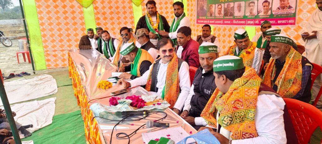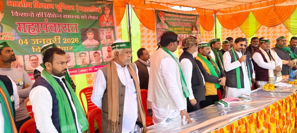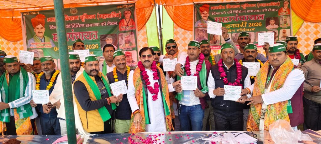 उन्होंने कहा कि आज आलू की लागत लगातार बढ़ रही है, लेकिन बाजार में किसानों को उचित दाम नहीं मिल रहे। किसान हर दिन कर्ज और घाटे की दलदल में धंसता जा रहा है।​”हमें उत्तर प्रदेश के माननीय मुख्यमंत्री जी पर पूर्ण विश्वास है। जिस प्रकार उन्होंने दिवाली पर गन्ना किसानों को सौगात दी थी, उसी तर्ज पर आलू किसानों के लिए ₹2500 प्रति क्विंटल का समर्थन मूल्य (MSP) घोषित कर सरकारी खरीद शुरू करनी चाहिए।”— ठाकुर धर्मेंद्र सिंह, राष्ट्रीय अध्यक्ष​संगठन की बढ़ी ताकत: बड़ी संख्या में नियुक्तियां और सदस्यता​इस महापंचायत के दौरान संगठन का विस्तार करते हुए दर्जनों पदाधिकारियों को नई जिम्मेदारी सौंपी गई और सैकड़ों किसानों ने यूनियन की सदस्यता ग्रहण की।​प्रमुख नियुक्तियां और उपस्थित चेहरे:​जिला कार्यकारिणी: संजय पाठक (जिला महामंत्री), नागेंद्र प्रताप (जिला अध्यक्ष), आनंद कुमार फौजी (सैनिक प्रकोष्ठ), डॉ. रविंद्र पाठक (जिला प्रभारी-डॉक्टर प्रकोष्ठ), शुघर सिंह (जिला संयोजक), नमन पाठक (जिला सचिव)।​तहसील एवं ब्लॉक स्तर: महेश कुमार सिंह (तहसील संयोजक), राघवेंद्र शर्मा (ब्लॉक अध्यक्ष-नारखी), निहाल सिंह व ऋषि पाल सिंह (तहसील संगठन मंत्री/महामंत्री), सतपाल सिंह तोमर (तहसील उपाध्यक्ष)।​युवा एवं अन्य नेतृत्व: युवा क्षेत्र अध्यक्ष अशोक यादव, विरज, ठाकुर सुनील सिंह, बंटी सिंह लोधी, और अनूप यादव सहित युवा प्रदेश सोशल मीडिया प्रभारी सुमित जादौन मौजूद रहे।​गाँव स्तर पर भी रविंद्र सिंह (ग्राम प्रभारी) और अक्षय कुमार (बदनपुर) जैसे कर्मठ कार्यकर्ताओं को जिम्मेदारी दी गई। इस दौरान भारी संख्या में मौजूद किसानों ने एकजुट होकर अपनी आवाज बुलंद की और चेतावनी दी कि यदि मांगों पर विचार नहीं हुआ तो आंदोलन को और तेज किया जाएगा।
